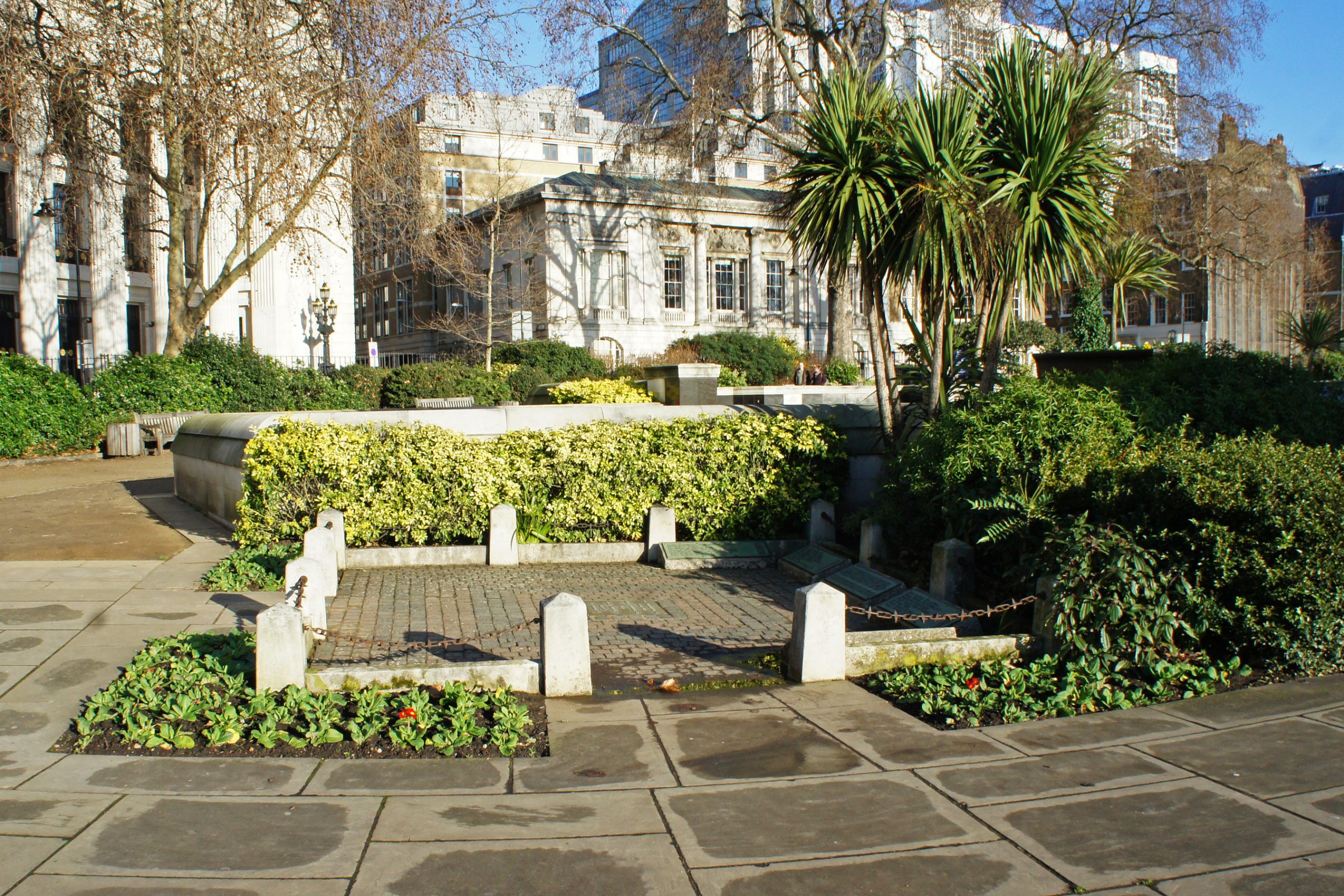 St Mary Aldermanbury Garden is the church that was destroyed by the Great Fire of London in 1666. It was rebuilt by Sir Christopher Wren and was again gutted during the Blitz in 1940, leaving only the walls. In 1966 the remains of the church were shipped to Fulton, Missouri, USA.